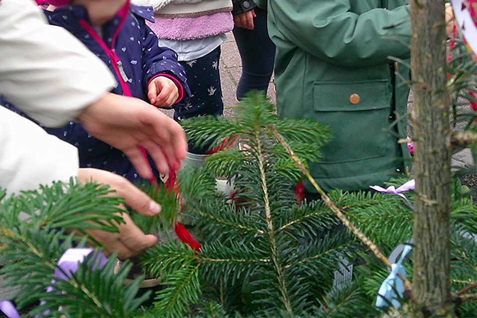 Mit sichtbarer Freude und Stolz hängten die Kinder die selbstgebastelten Dekorationen an die Zweige. Das Ergebnis ist wunderschön: Die Bäume strahlen nun in festlichem Glanz und verwandeln den Platz in eine stimmungsvolle, vorweihnachtliche Kulisse.